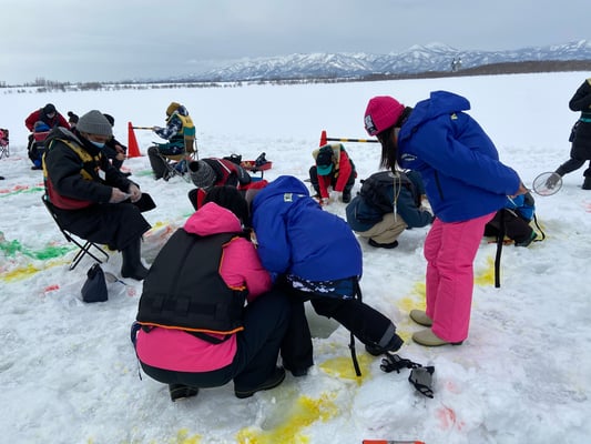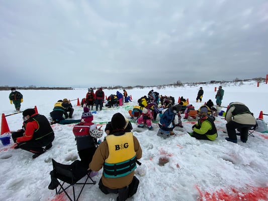 昨年は暖冬の影響で遊水地が充分に凍らず、開催できなかったワカサギ釣り。