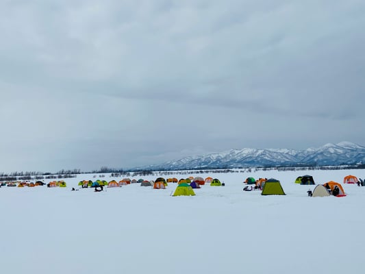 たくさんのカラフルなテントで賑わう氷上でのワカサギ釣り。